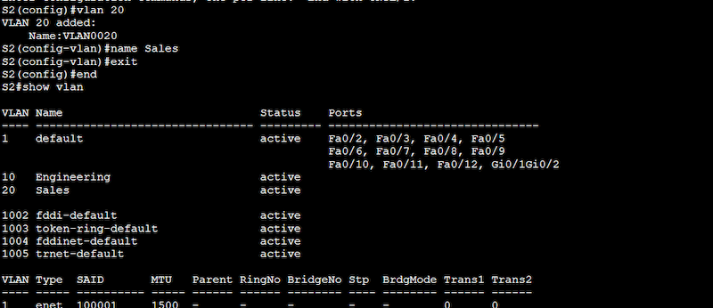 Use the “show vlan” command to see the configured VLANs. From the output below, you’ll notice that the two new VLANs 10 (Engineering) and 20 (Sales) are indeed configured and active but not yet assigned to any port.