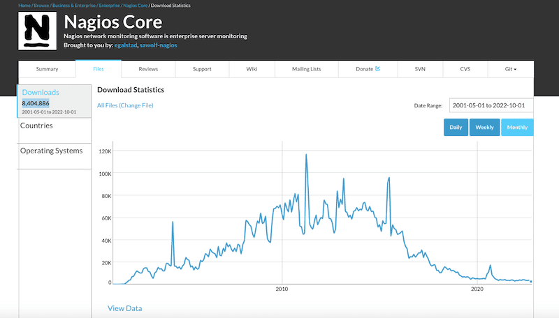 From 2010 to 2015, Nagios was one of the favorite open-source network monitoring solutions. Fast forward to 2022, and Nagios Core has been downloaded 8.4 million times from SourceForge.net. Although still loved by the monitoring community (especially among Linux admins), its roaring popularity started to decrease in 2016. It is believed that this loss of interest started when other more ‘automatic’ and easier-to-deploy tools started to appear.