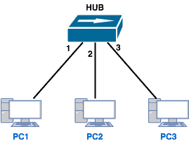For example, if PC1 wants to send a packet to PC2, the hub will forward that packet out both ports 2 and 3, even though PC3 has no business with that packet.