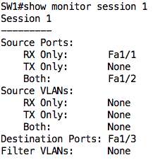 To show you that we can monitor several source ports, let us edit our configuration to also monitor traffic ingress Fa1/1. This means there will be some redundant packets but that’s okay for our test scenario. To achieve this, just add the following: